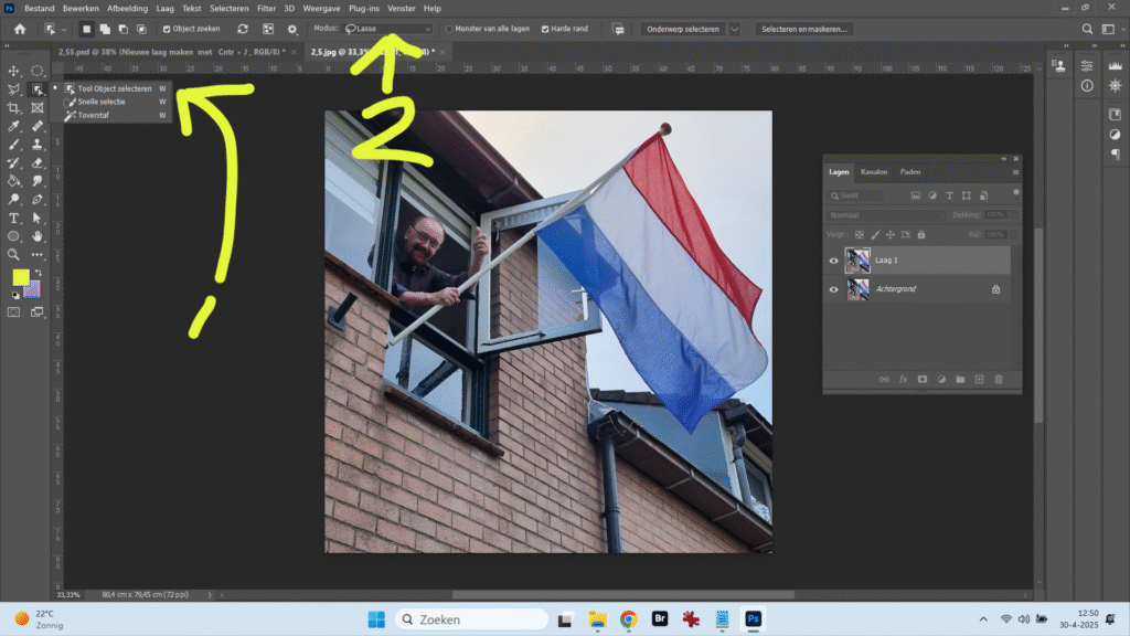 Shift in drukken om de 2e selectie te maken (of het 2e blokje bovenaan aanklikken om de selectie toe te voegen. Met Ctrl+J een nieuwe laag maken van de selecties.